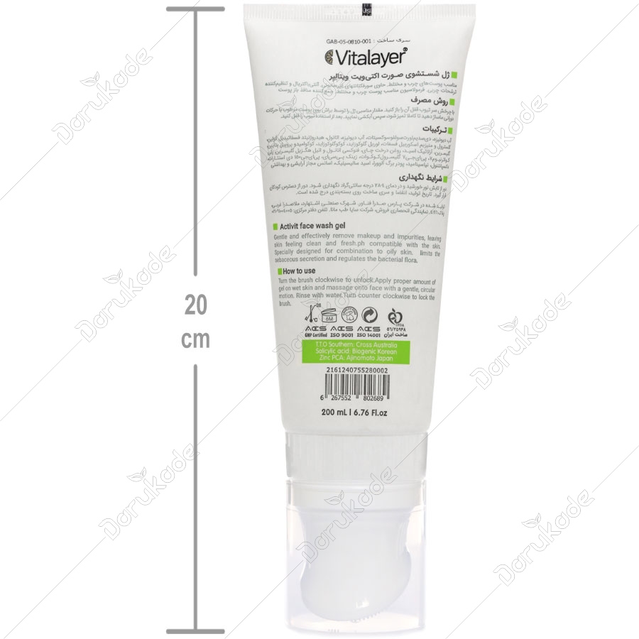 ژل شستشوی ویتالیر پوست چرب اکتی ویت به منظور پاکسازی پوست از چربی، آلودگی و آثار آرایش مناسب برای مصرف پوست مختلط تا چرب در بسته بندی تیوپ به حجم 200 میلی لیتر همراه با سر براش دار تولید می شود.